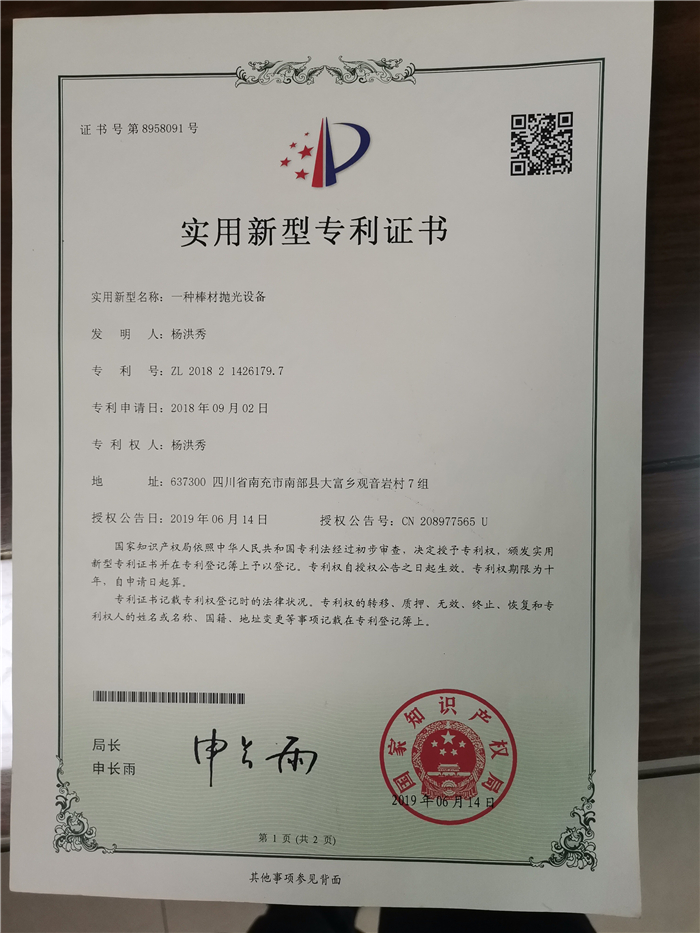 雙特制管機專利證書